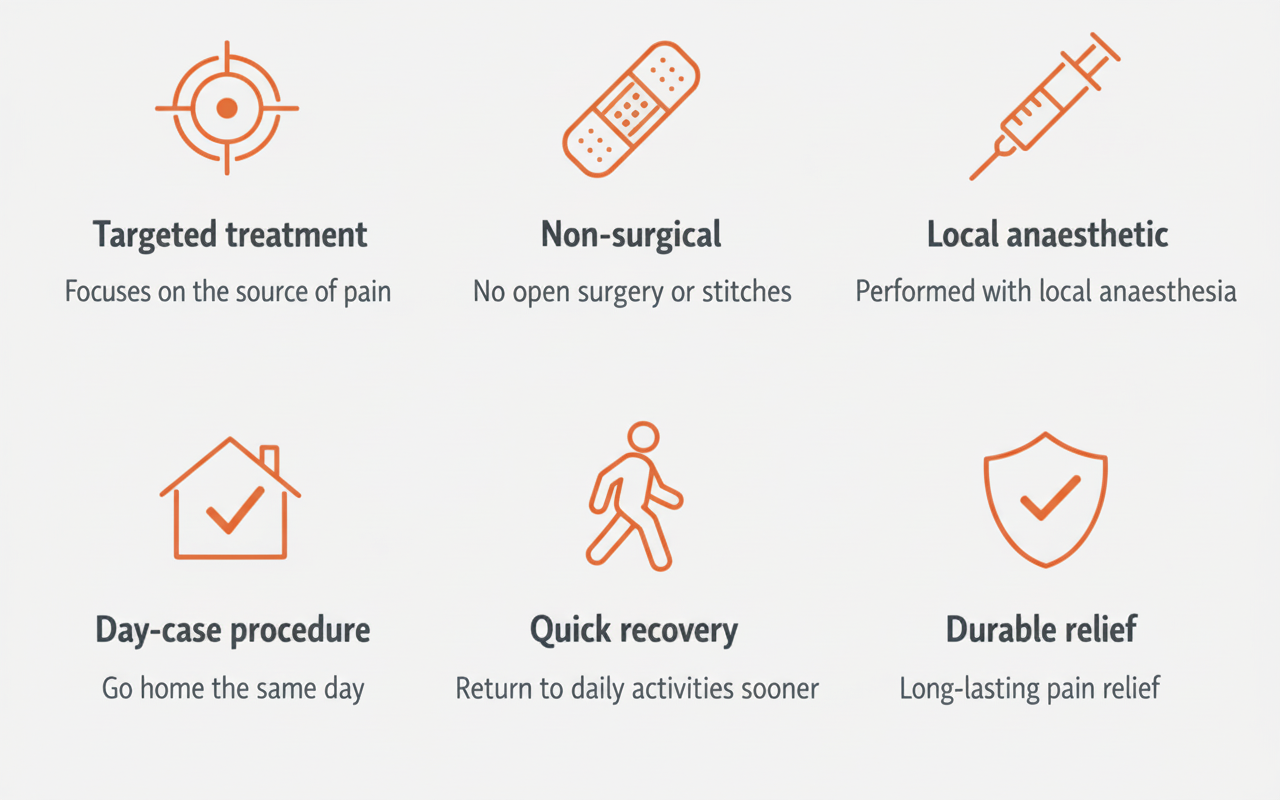 With embolisation treatment, tiny abnormal blood vessels that keep the tendon irritated are carefully targeted. By reducing this unwanted blood flow, the aim is to settle inflammation, ease pain, and help people return more comfortably to everyday activities and exercise—especially when symptoms have been present for a long time.